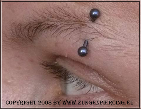 Augenbrauen Piercing: das Augenbrauenpiercing ist ein sogenanntes Oberflächenpiercing, das unter der Haut auf einer Stichkanaleingang und Stichkanalausgang gleichen Ebene liegt.Es kann über die ganze Augenbrauenlinie gepierct werden, wird aber bevorzugt im äusseren Drittel der Augenbrauen gestochen. Weil das Augenbrauenpiercing nur unter der Haut liegt ist Vorsicht im Umgang geboten, da das Piercing bei Entzündungen herauswachsen kann und Narben hinterlässt. Die Verletzung der Nerven ist eine weitere Problematik bei dieser Piercingart. Als Piercingschmuck kommen gebogene Barbells ( Curved Barbell ) oder Ball Closure Rings zum Einsatz. Piercingbananen haben wir bei diesem Piercing auch schon gesehen. Es kann horizontal oder vertikal gestochen werden.