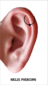 Helix Piercing: das Helixpiercing befindet sich an der Ohrkante und wird durch Knorpelgewebe gestochen. Das verlängert den Heilungsprozess und den Pflegeaufwand erheblich. Als Piercingschmuck wird im Regelfall ein Ball Closure Ring verwendet. Doch das ist wie immer Geschmackssache.
