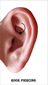 Rook Piercing: das Rookpiercing sitzt in der Ohrmuschel an einer bestimmten Stelle, senkrecht im sogenannten Antihelix. Das ist der Knorpelsteg zwischen dem INNER CONCH und OUTER CONCH. Als Erstpiercing ist ein Barbell sowie ein Ballring gleichermassen gut geeignet. Den Namen verdankt dieses Piercing seinem Erfinder ERIK "Rook" DAKOTA.