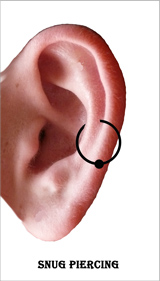 Snug Piercing: das Snugpiercing verläuft direkt durch den Ohrknorpel und sitzt in der Knorpelauswölbung, die parallel zur Ohrkante verläuft. Der Ohrknorpel muß dafür aber ausreichend groß ausgebildet, um dieses Piercing zu ermöglichen. Die Abheilzeit kann sich verlängern, wenn auf dieser Seite beim schlafen gelegen wird. Die normale Wundheilung beläuft sich auf ca. 2 Monate - 9 Monate. Als Piercingschmuck sind dafür kleinere Ballrings geeignet.